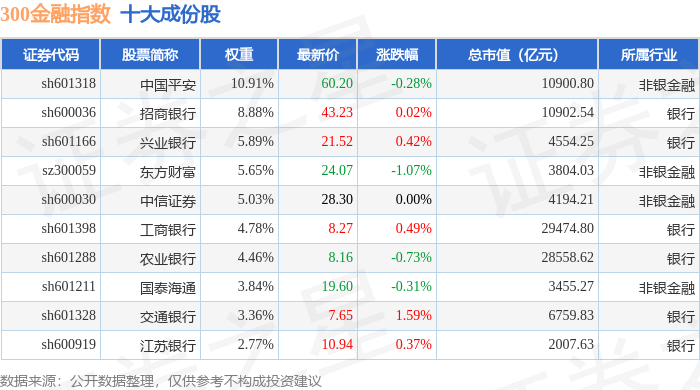 300金融(399914)指数十大成份股详情如下: