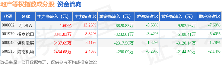 资金流向方面,地产等权(399983)指数成份股当日主力资金净流入合计3.22亿元,游资资金净流出合计1.27亿元,散户资金净流出合计1.96亿元。成份股资金流向详情见下表: