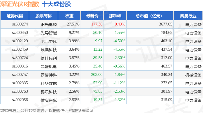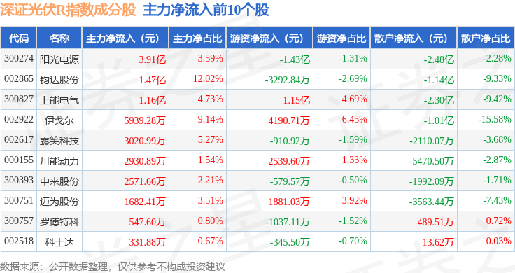 资金流向方面,深证光伏R(470035)指数成份股当日主力资金净流出合计7.34亿元,游资资金净流入合计2.5亿元,散户资金净流入合计4.84亿元。成份股资金流向详情见下表: