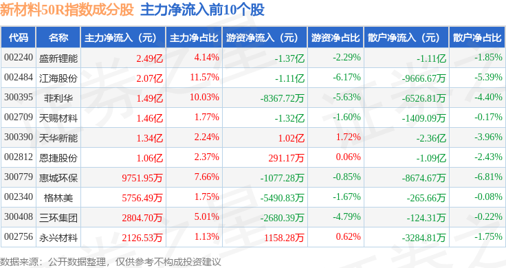 资金流向方面,新材料50R(470042)指数成份股当日主力资金净流出合计32.75亿元,游资资金净流出合计1.25亿元,散户资金净流入合计34.0亿元。成份股资金流向详情见下表: