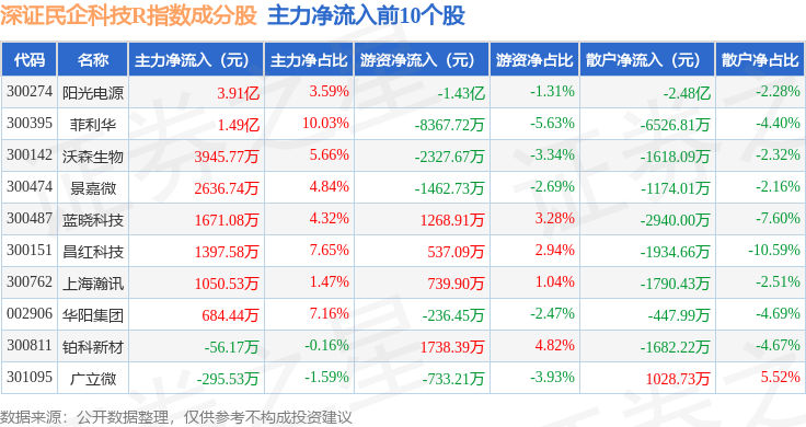 资金流向方面,深证民企科技R(470059)指数成份股当日主力资金净流出合计32.52亿元,游资资金净流入合计1.2亿元,散户资金净流入合计31.32亿元。成份股资金流向详情见下表: