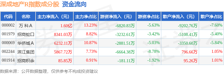 资金流向方面,深成地产R(471001)指数成份股当日主力资金净流入合计3.66亿元,游资资金净流出合计1.98亿元,散户资金净流出合计1.68亿元。成份股资金流向详情见下表: