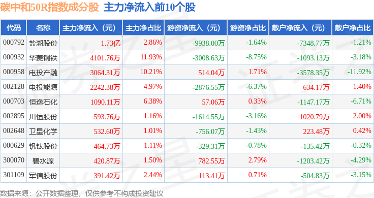 资金流向方面,碳中和50R(480021)指数成份股当日主力资金净流出合计47.1亿元,游资资金净流入合计1247.58万元,散户资金净流入合计46.98亿元。成份股资金流向详情见下表: