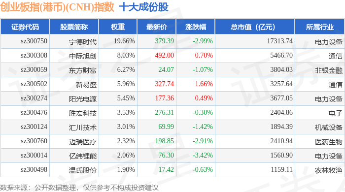 创业板指(港币)(CNH)(970006)指数十大成份股详情如下: