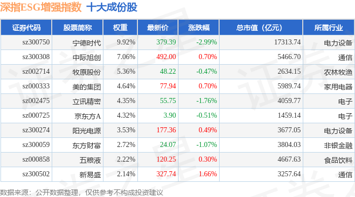 资金流向方面,深指ESG增强(970032)指数成份股当日主力资金净流出合计57.34亿元,游资资金净流入合计1.2亿元,散户资金净流入合计56.14亿元。成份股资金流向详情见下表: