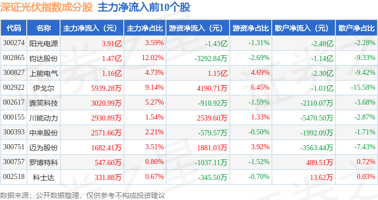 资金流向方面,深证光伏(970035)指数成份股当日主力资金净流出合计7.34亿元,游资资金净流入合计2.5亿元,散户资金净流入合计4.84亿元。成份股资金流向详情见下表: