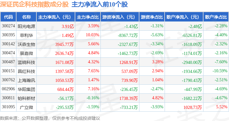 资金流向方面,深证民企科技(970059)指数成份股当日主力资金净流出合计32.52亿元,游资资金净流入合计1.2亿元,散户资金净流入合计31.32亿元。成份股资金流向详情见下表:
