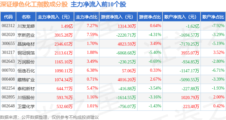 资金流向方面,深证绿色化工(970076)指数成份股当日主力资金净流出合计31.69亿元,游资资金净流入合计2.05亿元,散户资金净流入合计29.63亿元。成份股资金流向详情见下表: