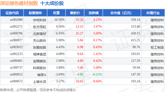 证券之星消息,11月20日,深证绿色建材(970077)指数报收于1358.27点,涨1.78%,成交75.91亿元,换手率1.97%。当日该指数成份股中,上涨的有22家,北新建材以5.69%的涨幅领涨,下跌的有8家,罗普斯金以2.95%的跌幅领跌。