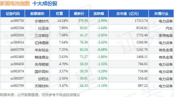 资金流向方面,新能电池(980032)指数成份股当日主力资金净流出合计56.55亿元,游资资金净流入合计3.38亿元,散户资金净流入合计52.76亿元。成份股资金流向详情见下表: