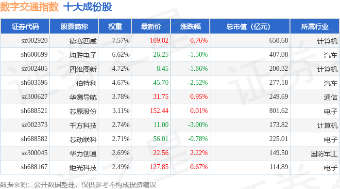 证券之星消息,11月20日,数字交通(980075)指数报收于3055.7点,跌0.46%,成交206.81亿元,换手率1.79%。当日该指数成份股中,上涨的有19家,诚迈科技以3.78%的涨幅领涨,下跌的有31家,浙江世宝以4.7%的跌幅领跌。