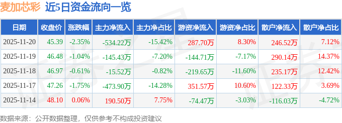 证券之星消息,截至2025年11月20日收盘,麦加芯彩(603062)报收于45.39元,下跌2.35%,换手率2.0%,成交量7572.0手,成交额3464.23万元。