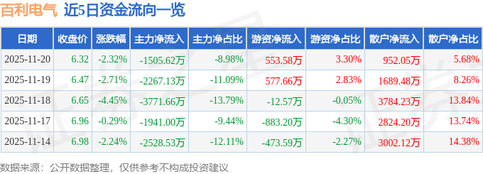 证券之星消息,截至2025年11月20日收盘,百利电气(600468)报收于6.32元,下跌2.32%,换手率2.42%,成交量26.36万手,成交额1.68亿元。