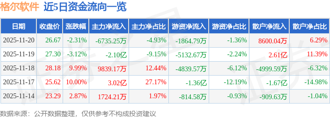 证券之星消息,截至2025年11月20日收盘,格尔软件(603232)报收于26.67元,下跌2.31%,换手率21.88%,成交量50.6万手,成交额13.67亿元。