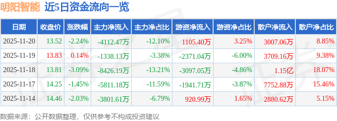 证券之星消息,截至2025年11月20日收盘,明阳智能(601615)报收于13.52元,下跌2.24%,换手率1.09%,成交量24.78万手,成交额3.4亿元。