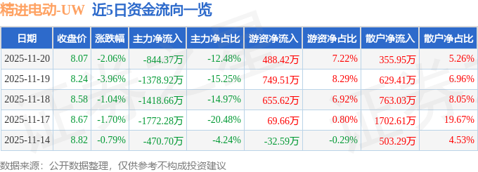 证券之星消息,截至2025年11月20日收盘,精进电动(688280)报收于8.07元,下跌2.06%,换手率1.6%,成交量8.31万手,成交额6767.4万元。