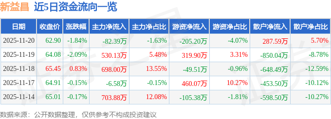 11月20日的资金流向数据方面,主力资金净流出82.39万元,占总成交额1.63%,游资资金净流出205.2万元,占总成交额4.07%,散户资金净流入287.59万元,占总成交额5.7%。