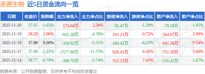 证券之星消息,截至2025年11月20日收盘,圣诺生物(688117)报收于37.65元,下跌1.65%,换手率1.24%,成交量1.96万手,成交额7427.79万元。