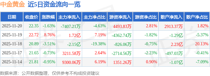 证券之星消息,截至2025年11月20日收盘,中金黄金(600489)报收于22.35元,下跌1.63%,换手率1.46%,成交量70.94万手,成交额16.0亿元。