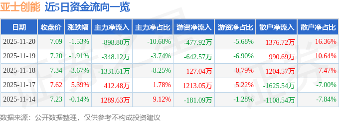 证券之星消息,截至2025年11月20日收盘,亚士创能(603378)报收于7.09元,下跌1.53%,换手率2.77%,成交量11.86万手,成交额8414.25万元。