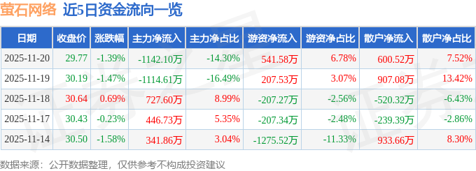 11月20日的资金流向数据方面,主力资金净流出1142.1万元,占总成交额14.3%,游资资金净流入541.58万元,占总成交额6.78%,散户资金净流入600.52万元,占总成交额7.52%。