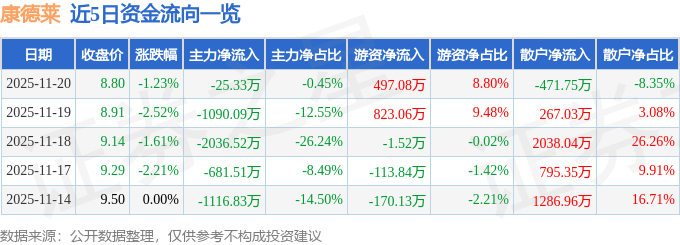 证券之星消息,截至2025年11月20日收盘,康德莱(603987)报收于8.8元,下跌1.23%,换手率1.46%,成交量6.38万手,成交额5648.1万元。