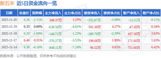 证券之星消息,截至2025年11月20日收盘,新五丰(600975)报收于6.26元,下跌1.11%,换手率1.71%,成交量17.39万手,成交额1.09亿元。