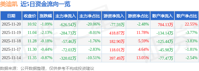 证券之星消息,截至2025年11月20日收盘,美迪凯(688079)报收于10.92元,下跌1.09%,换手率0.71%,成交量2.84万手,成交额3122.92万元。