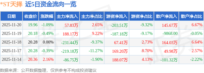 证券之星消息,截至2025年11月20日收盘,*ST天择(603721)报收于19.96元,下跌1.09%,换手率0.84%,成交量1.09万手,成交额2183.69万元。