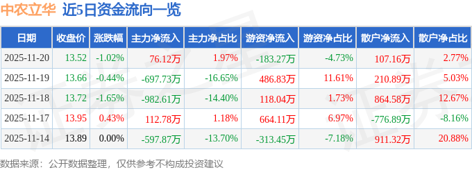 证券之星消息,截至2025年11月20日收盘,中农立华(603970)报收于13.52元,下跌1.02%,换手率1.06%,成交量2.86万手,成交额3871.86万元。