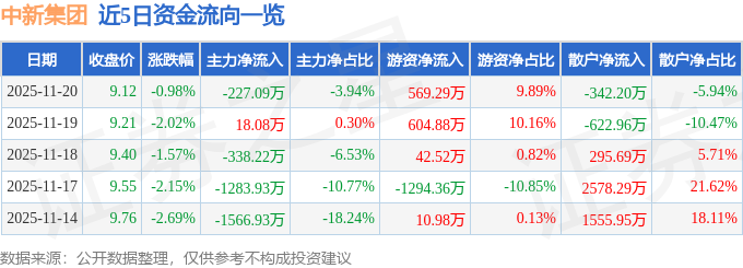 证券之星消息,截至2025年11月20日收盘,中新集团(601512)报收于9.12元,下跌0.98%,换手率0.42%,成交量6.32万手,成交额5756.77万元。