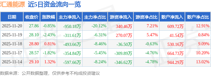 证券之星消息,截至2025年11月20日收盘,汇通能源(600605)报收于27.86元,下跌0.85%,换手率0.82%,成交量1.69万手,成交额4722.07万元。