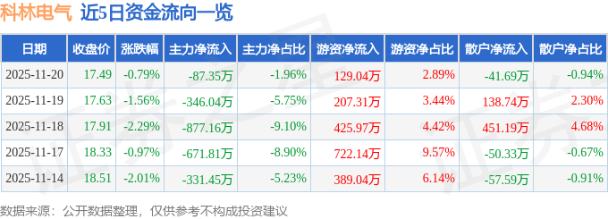 证券之星消息,截至2025年11月20日收盘,科林电气(603050)报收于17.49元,下跌0.79%,换手率0.63%,成交量2.54万手,成交额4457.46万元。