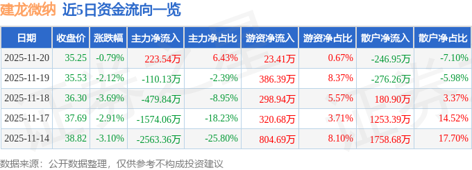 证券之星消息,截至2025年11月20日收盘,建龙微纳(688357)报收于35.25元,下跌0.79%,换手率0.98%,成交量9854.0手,成交额3478.87万元。