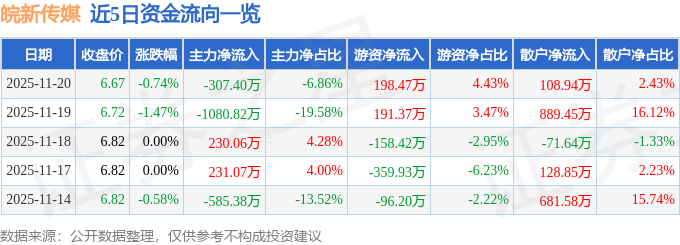 证券之星消息,截至2025年11月20日收盘,皖新传媒(601801)报收于6.67元,下跌0.74%,换手率0.34%,成交量6.69万手,成交额4478.0万元。