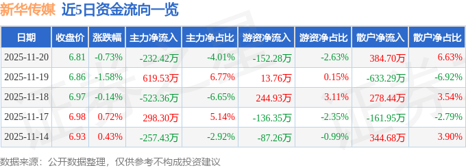 证券之星消息,截至2025年11月20日收盘,新华传媒(600825)报收于6.81元,下跌0.73%,换手率0.81%,成交量8.46万手,成交额5801.13万元。