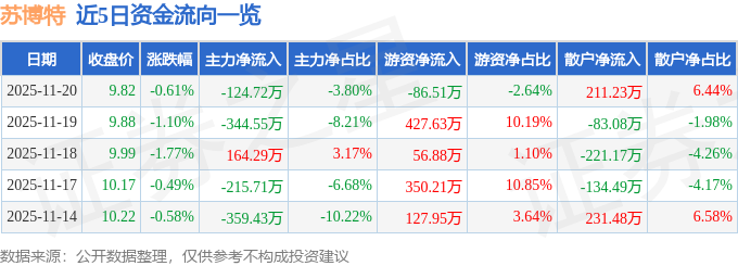 证券之星消息,截至2025年11月20日收盘,苏博特(603916)报收于9.82元,下跌0.61%,换手率0.79%,成交量3.32万手,成交额3280.71万元。