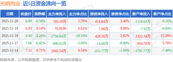 证券之星消息,截至2025年11月20日收盘,光明肉业(600073)报收于6.89元,下跌0.58%,换手率1.87%,成交量17.55万手,成交额1.22亿元。