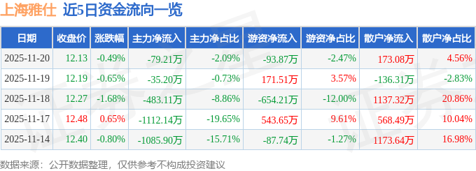 证券之星消息,截至2025年11月20日收盘,上海雅仕(603329)报收于12.13元,下跌0.49%,换手率1.51%,成交量3.13万手,成交额3795.41万元。