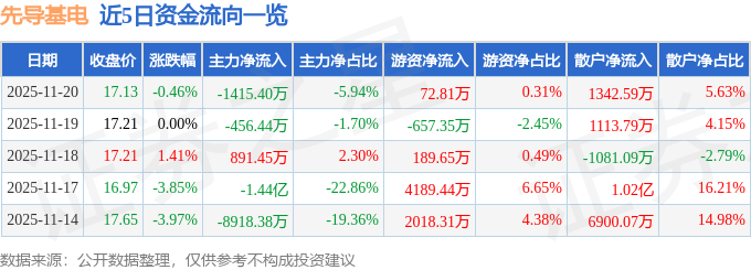 证券之星消息,截至2025年11月20日收盘,先导基电(600641)报收于17.13元,下跌0.46%,换手率1.49%,成交量13.88万手,成交额2.38亿元。