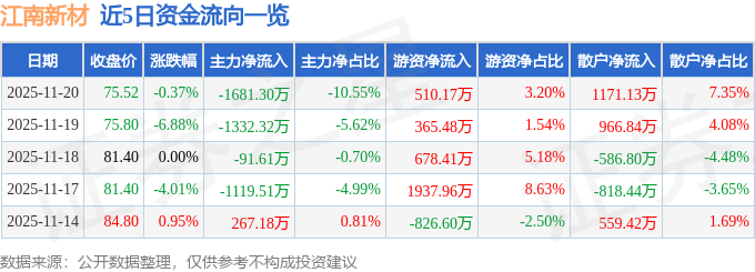 证券之星消息,截至2025年11月20日收盘,江南新材(603124)报收于75.52元,下跌0.37%,换手率7.1%,成交量2.07万手,成交额1.59亿元。