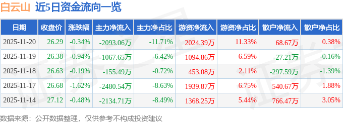 证券之星消息,截至2025年11月20日收盘,白云山(600332)报收于26.29元,下跌0.34%,换手率0.48%,成交量6.77万手,成交额1.79亿元。
