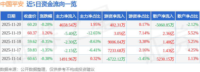 证券之星消息,截至2025年11月20日收盘,中国平安(601318)报收于60.2元,下跌0.28%,换手率0.37%,成交量39.45万手,成交额23.87亿元。