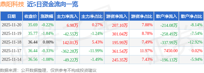 证券之星消息,截至2025年11月20日收盘,鼎阳科技(688112)报收于35.69元,下跌0.22%,换手率0.46%,成交量7357.0手,成交额2628.61万元。
