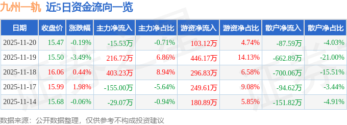 证券之星消息,截至2025年11月20日收盘,九州一轨(688485)报收于15.47元,下跌0.19%,换手率1.59%,成交量1.4万手,成交额2173.98万元。