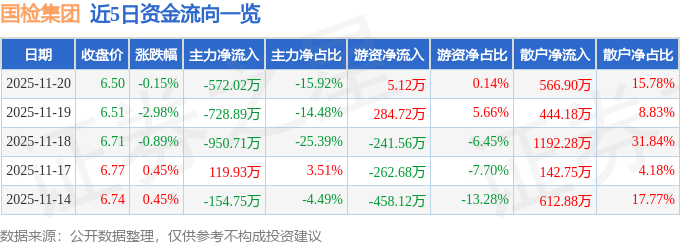证券之星消息,截至2025年11月20日收盘,国检集团(603060)报收于6.5元,下跌0.15%,换手率0.69%,成交量5.52万手,成交额3592.11万元。
