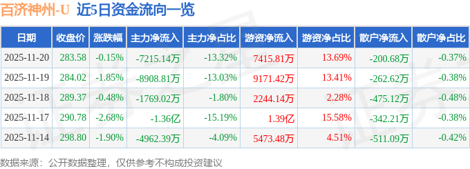 证券之星消息,截至2025年11月20日收盘,百济神州(688235)报收于283.58元,下跌0.15%,换手率1.66%,成交量1.9万手,成交额5.42亿元。