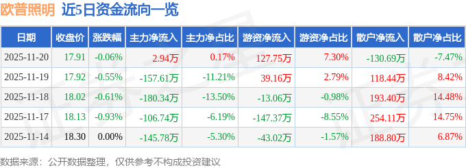 证券之星消息,截至2025年11月20日收盘,欧普照明(603515)报收于17.91元,下跌0.06%,换手率0.13%,成交量9769.0手,成交额1750.28万元。