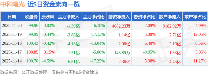 11月20日的资金流向数据方面,主力资金净流出1.39亿元,占总成交额6.18%,游资资金净流入4682.23万元,占总成交额2.09%,散户资金净流入9182.92万元,占总成交额4.09%。