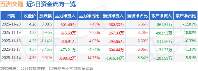 证券之星消息,截至2025年11月20日收盘,五洲交通(600368)报收于4.28元,上涨0.0%,换手率0.98%,成交量15.71万手,成交额6725.27万元。